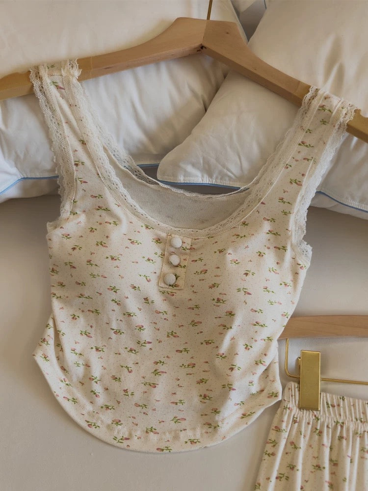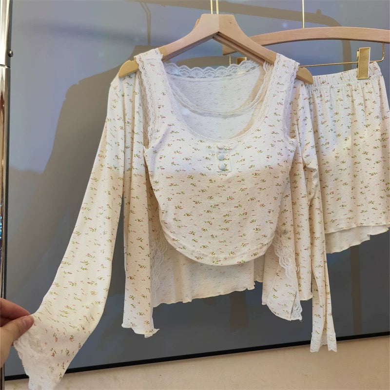 Stay cozy and stylish with this 4-piece pajama set, featuring a floral tank top, lace-trim cardigan, elastic waist pants, and matching shorts. Perfect for year-round comfort and feminine charm.