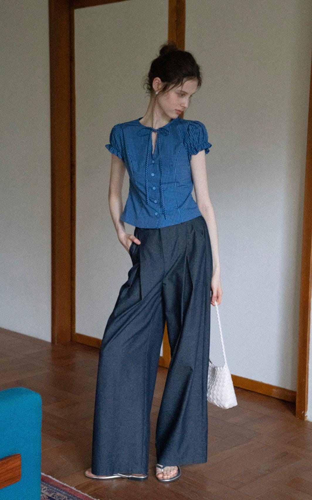 Brighten up your wardrobe with this charming Blue Gingham Ruffle Sleeve Blouse. Featuring a classic blue and white checkered pattern, this top is designed with delicate ruffled sleeves and a subtle keyhole neckline for a touch of femininity. The fitted silhouette and button-down front make it perfect for both casual and semi-formal occasions. Pair it with high-waisted trousers or a skirt for a fresh, vintage-inspired look that's effortlessly stylish and comfortable all day long.