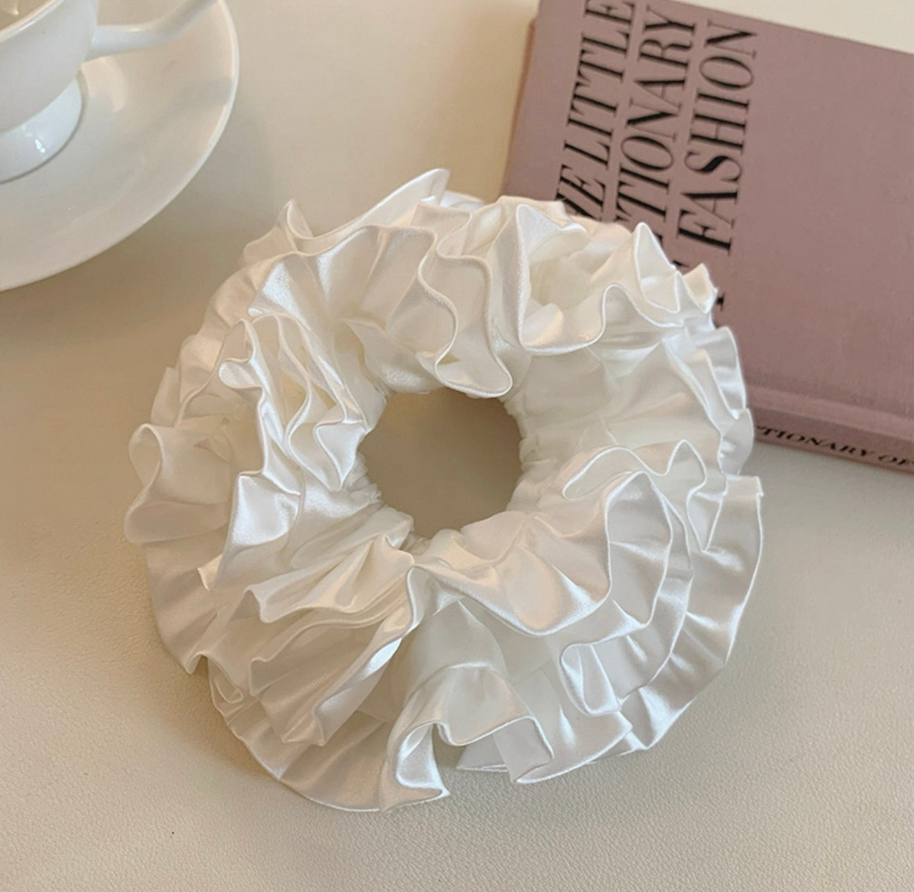 Elegant White Satin Ruffle Scrunchie