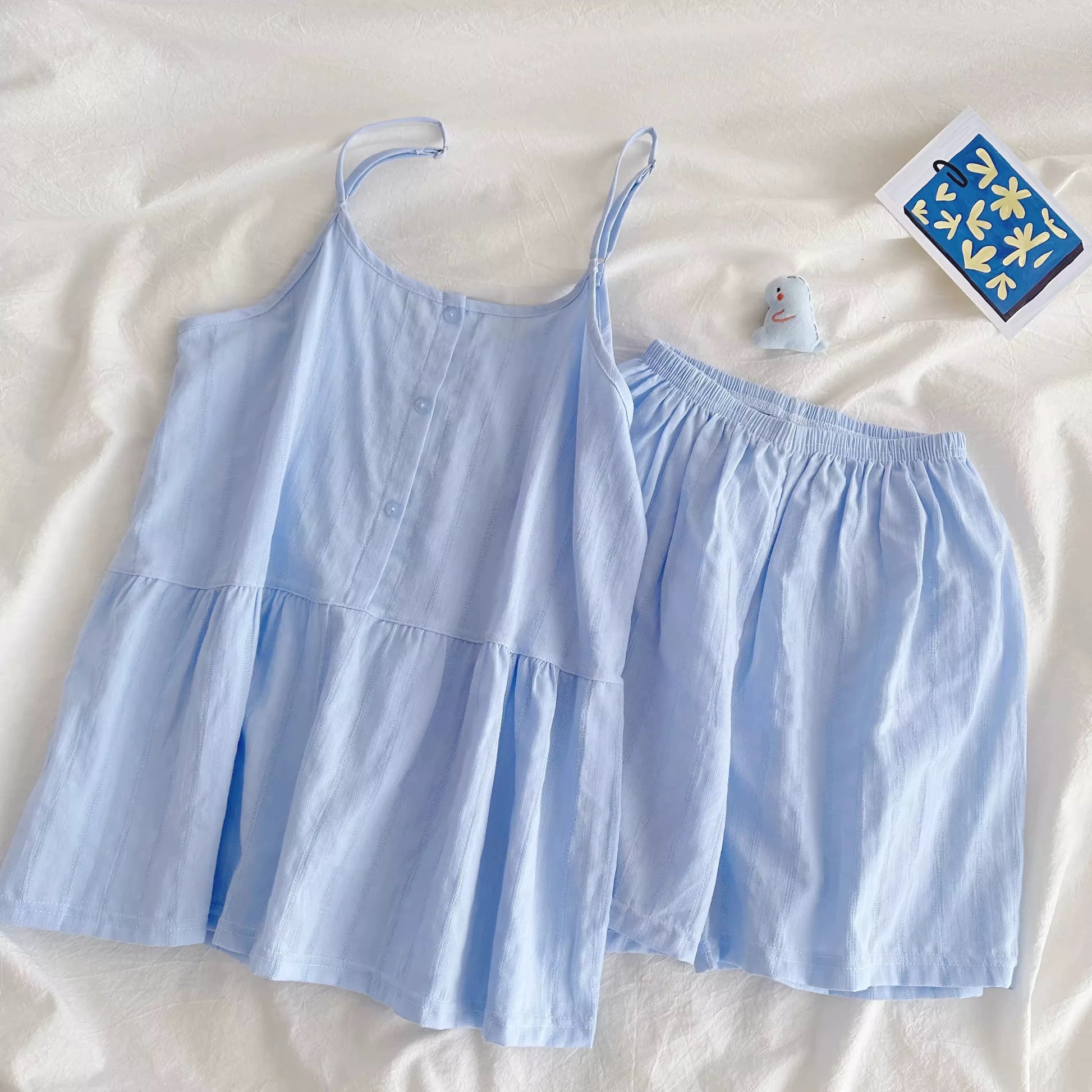 This airy pajama set features a soft light blue color in a lightweight cotton fabric. The cami top has adjustable straps and a button-down front for comfort and style. Matching elastic-waist shorts complete the look, making it ideal for lounging or warm-weather sleepwear.