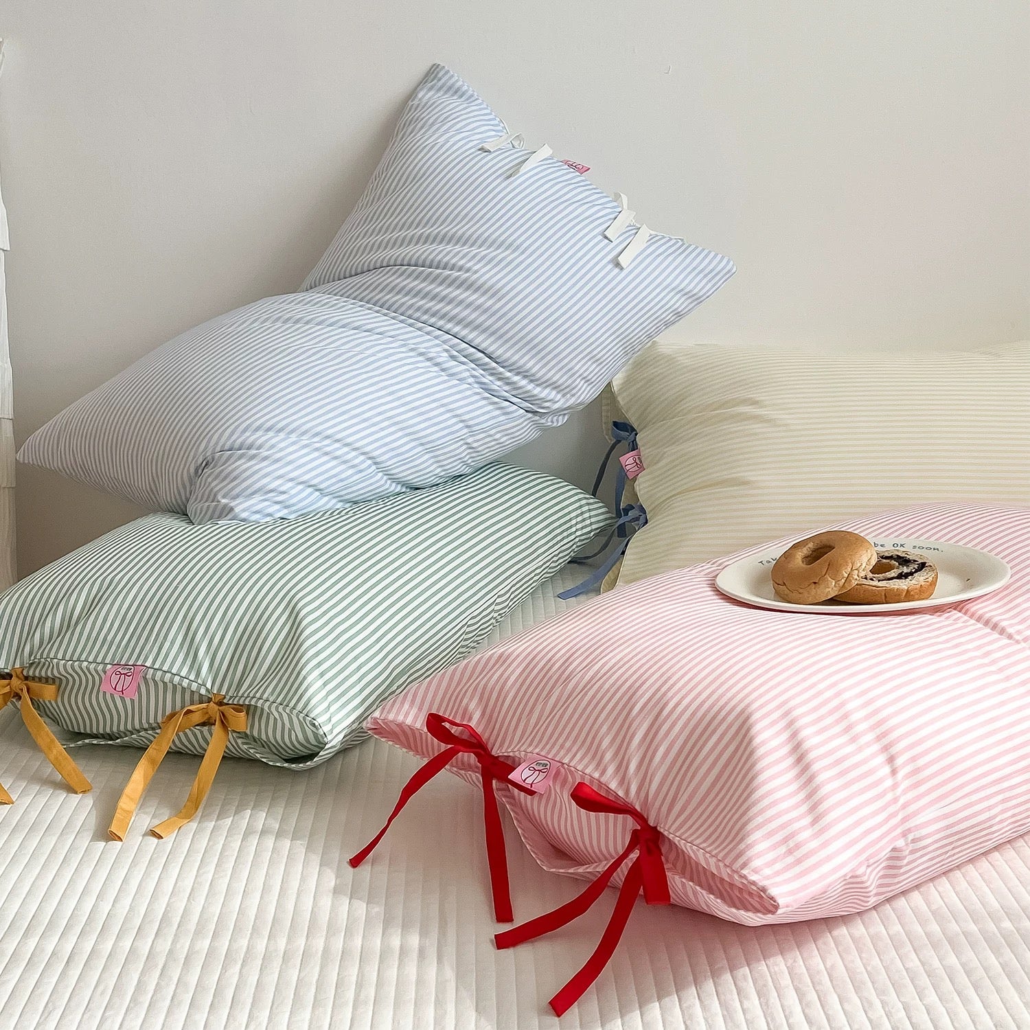 Striped Cotton Pillowcases with Bow Tie Closures – Multicolor Pastel Bedding (set of 2)