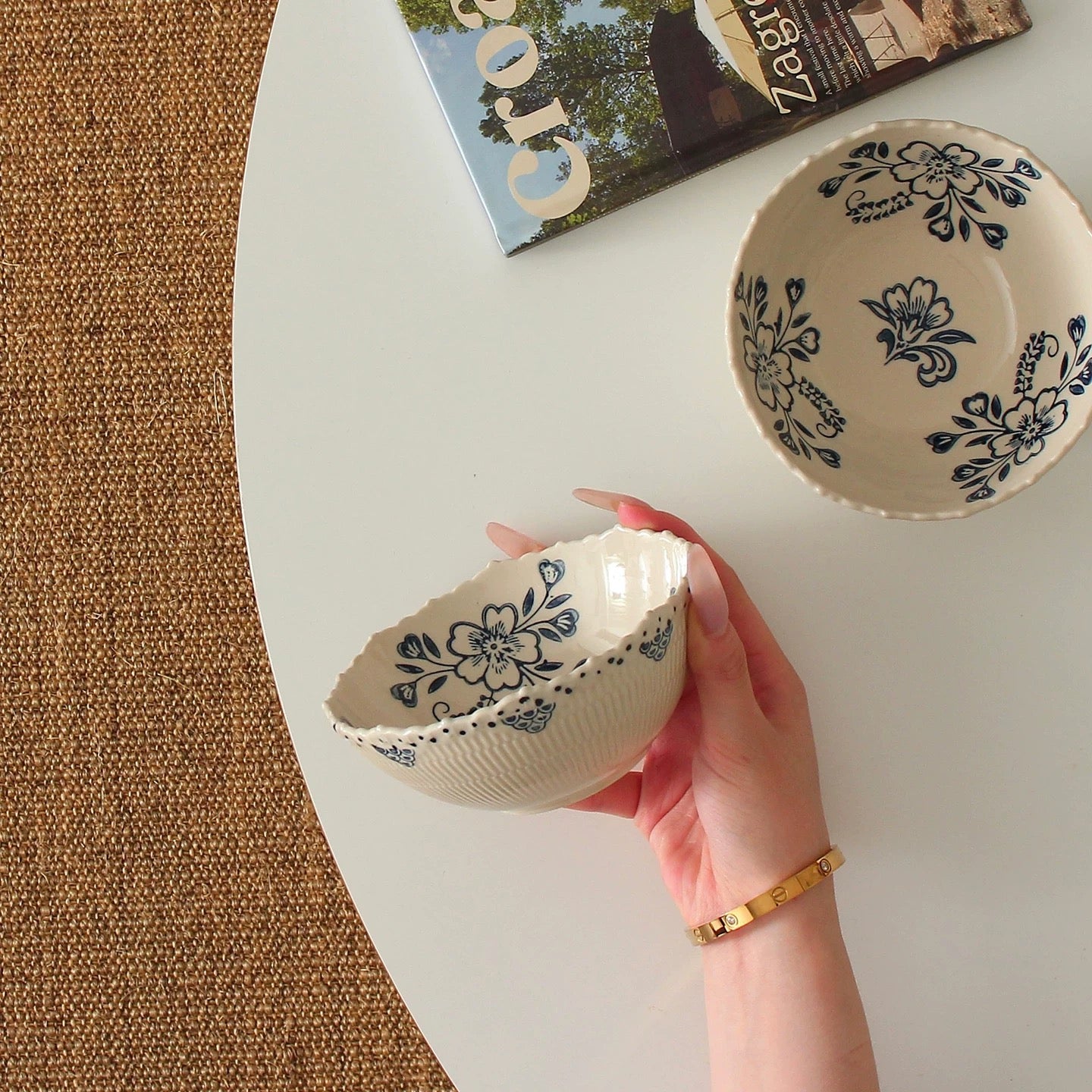 A nostalgic nod to European heritage, this blue-and-cream bowl features a scalloped edge and intricate floral details. Its hand-finished glaze gives it a soft, lived-in texture that feels straight from a countryside kitchen.