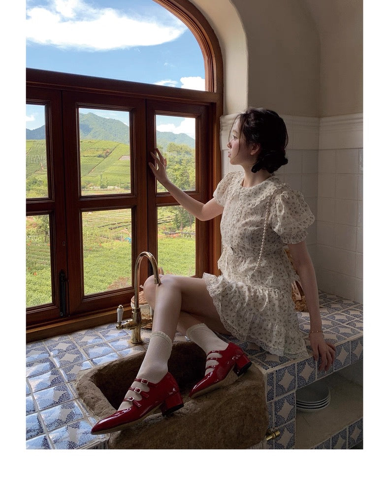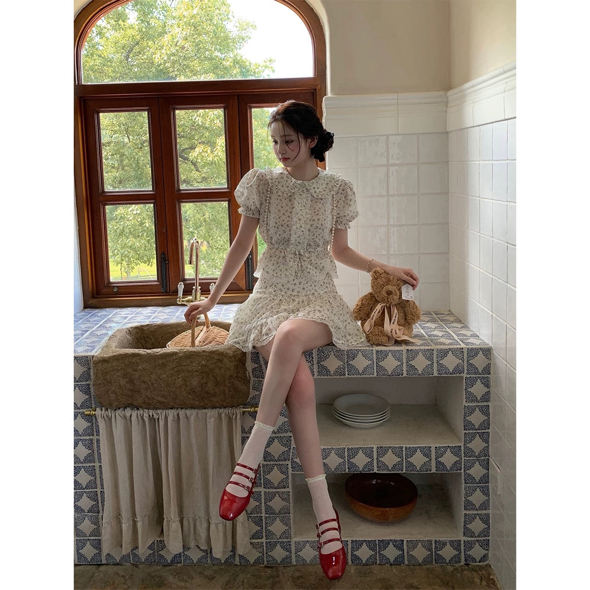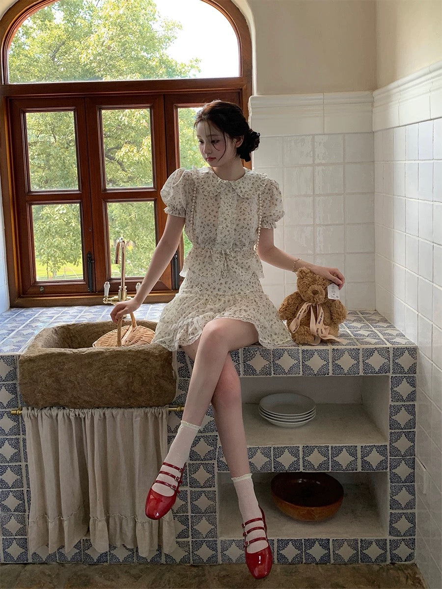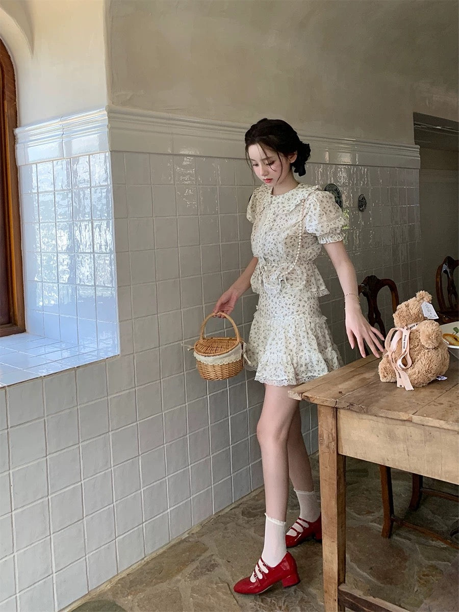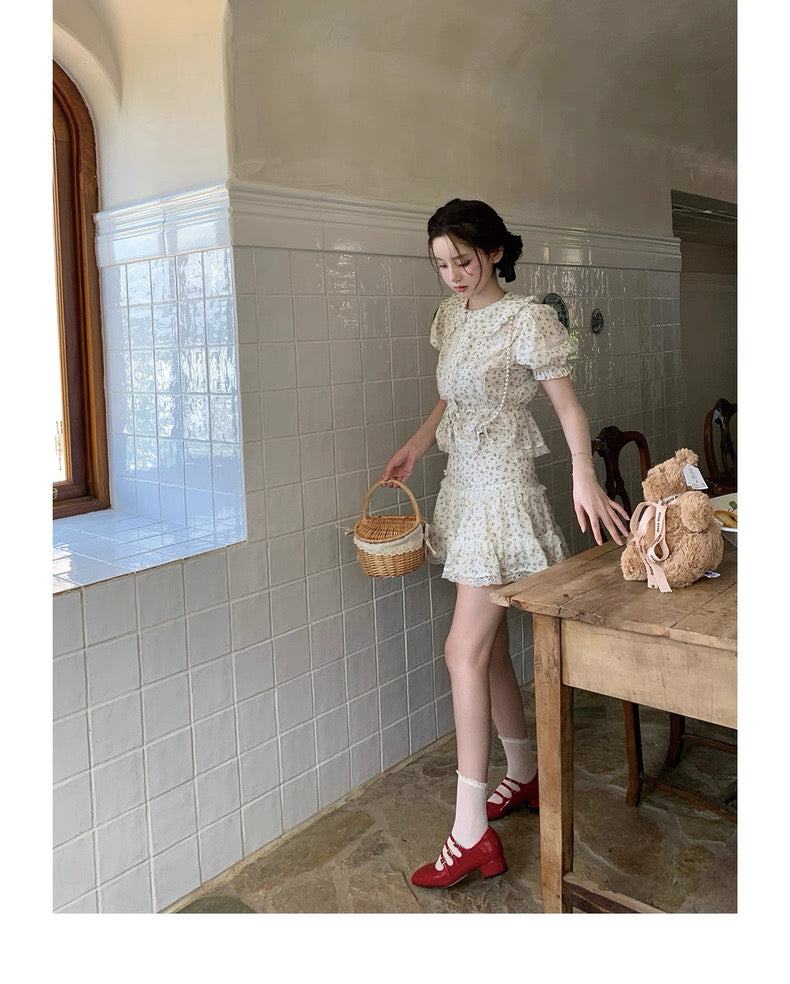 White Floral Lace Puff Sleeve Mini Skirt SEt - Cottagecore Ruffle Hem Short Skirt and Top - Romantic Embroidered A-Line Skirt and Top
