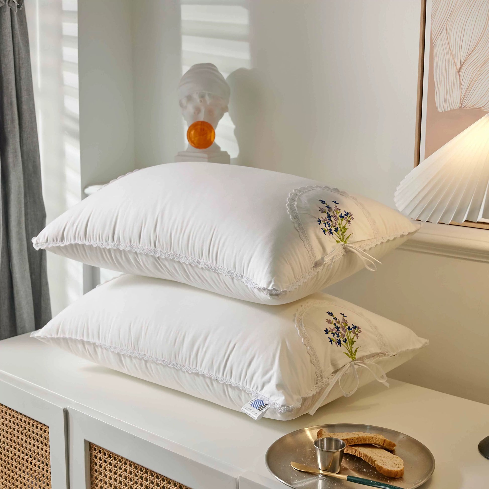 Add romantic charm to your bed with these pristine white pillowcases embroidered with delicate lavender sprigs. Accented with scalloped lace and satin ribbons, they bring a soft cottagecore or vintage aesthetic to your space.