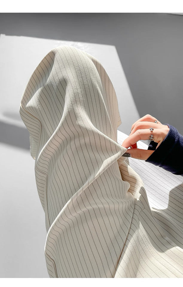 Soft cream with subtle pinstripes, these trousers embody understated elegance. With a high waist and flowy wide leg design, they’re ideal for workwear, smart casual outings, or chic minimalist looks.